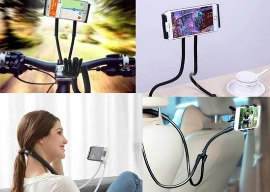 Maar dat is niet de enige functie van de Lazy Neck Smartphone houder! De neksteun is flexibel en kan gebogen worden in allerlei vormen. Zo is het op het ene moment een nekhouder en het andere moment een selfiestick.