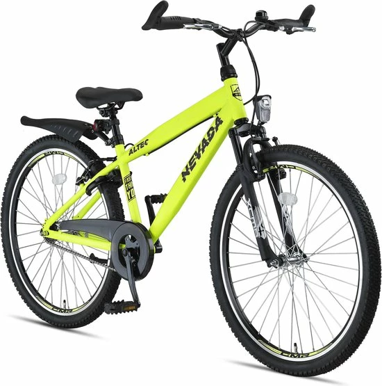Altec Nevada Kinderfiets Jongens 26 inchOnze Altec fietsen zijn nog niet afgemonteerd en worden in een doos verstuurd. Zie de handleiding onderaan voor instructies. Altec Nevada Kinderfiets Jongens 26 inch De Altec Nevada is een populaire Kinderfiets Jongens met stevig stalen frame en vervende voorvork. Met deze fiets kun je altijd veilig afremmen door middel van de handrem én terugtrap.Altec Nevada Kinderfiets Jongens 26 inch – Is een kinderfiets waarmee met veel plezier gereden kan worden! De stevige fiets kan makkelijk tegen een stootje. Dit komt mede door het stevige frame waarover deze beschikt. Deze is namelijk volledig gemaakt van staal. We raden je wel aan de fiets zoveel mogelijk binnen te stallen, dit omdat bij staal oxidatievorming niet volledig uit te sluiten is.Aan comfort is ook zeker gedacht bij deze fiets. De voorvork beschikt namelijk over vering. Hierdoor worden oneffenheden in het wegdek goed opgevangen. Uiteraard is er ook aan de veiligheid van de fiets en fietser gedacht. De Altec Nevada heeft namelijk 2 velgremmen én een terugtraprem. De velgen bestaan uit dubbelwandig aluminium en zijn daarom bestand tegen roest.LET OP: Spatborden inbegrepen Verende voorvork: Een verende voorvork biedt net dat beetje extra comfort Onderhoudsarm: Het onderhoudsarme karakter maakt deze fiets uiterst geschikt voor dagelijks gebruik Voordelig: Zeer mooie prijs kwaliteitsverhouding Design: De fiets heeft een stoer en sportief design Verlichting werkt op batterijen Staal: bij een stalen frame/onderdelen is oxidatie niet uit te sluiten Derailleur en remmen: Open systeem, onderhoudsgevoelig. (advies onderhoudspakket)