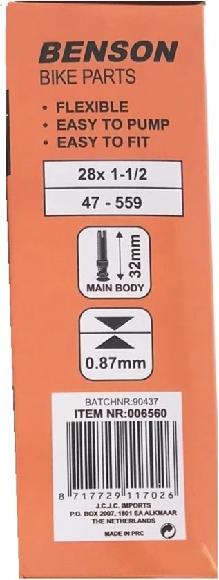 De binnenbanden van Benson onderscheiden zich door een uitstekende prijs- kwaliteitverhouding. Met name geschikt voor 28 inch ATB, Mountainbike of fietsen. Uitgevoerd met een Blitz (Hollands) 40mm ventiel. De banden zijn gemaakt van hoogwaardig Rubber; wat garant staat voor een lange luchtdichtheid. Door de hoge mate van elasticiteit is de band in staat je buitenband optimaal te vullen en ondersteunen.