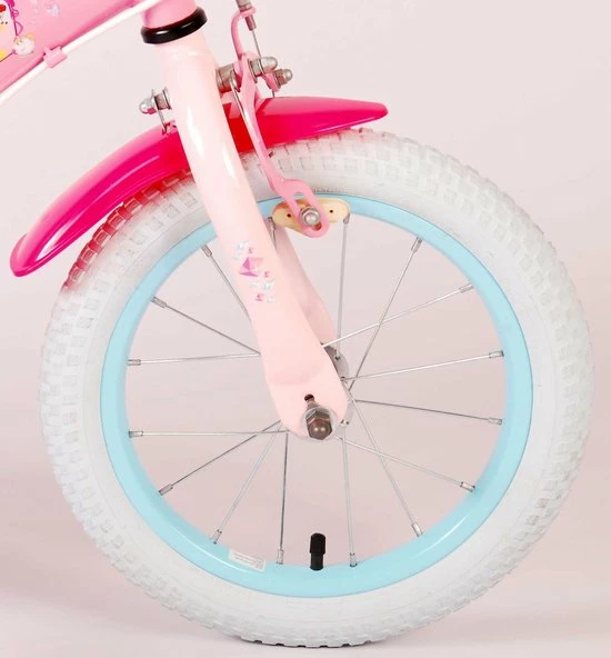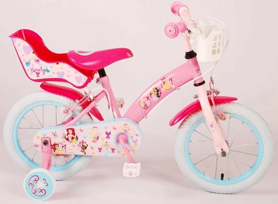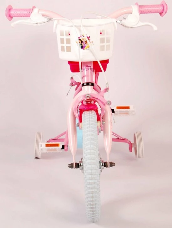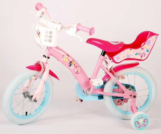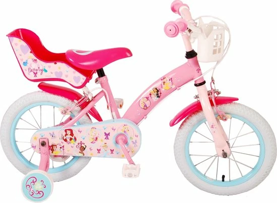 De Princess kinderfiets van Disney is perfect voor alle prinsessen die graag een rondje gaan fietsen! Alle meisjes hebben wel eens een Walt Disney film gezien waarin wonderschone prinsessen zoals Belle of Sneeuwwitje de show stelen. Bijna alle meisjes dromen ervan om later, als zij groot zijn, een ?chte prinses te zijn. Voor elke prinses in sp? is de mooie veertien inch meisjesfiets ontworpen! De fiets is compleet met een mooie poppenzit en een handig kunststof fietsmandje, zodat de kleine prinses haar spulletjes overal mee naar toe kan nemen. Verder is deze fiets voorzien van een mooi afgewerkte gesloten kettingkast, ter bescherming van de kleine vingertjes, kunststof spatborden en afneembare zijwieltjes om snel te kunnen leren fietsen. Om vaart te kunnen minderen heeft de fiets twee handremmen (geen terugtraprem). Op deze fiets wil ieder meisje wel naar school of naar haar vriendinnetjes fietsen!