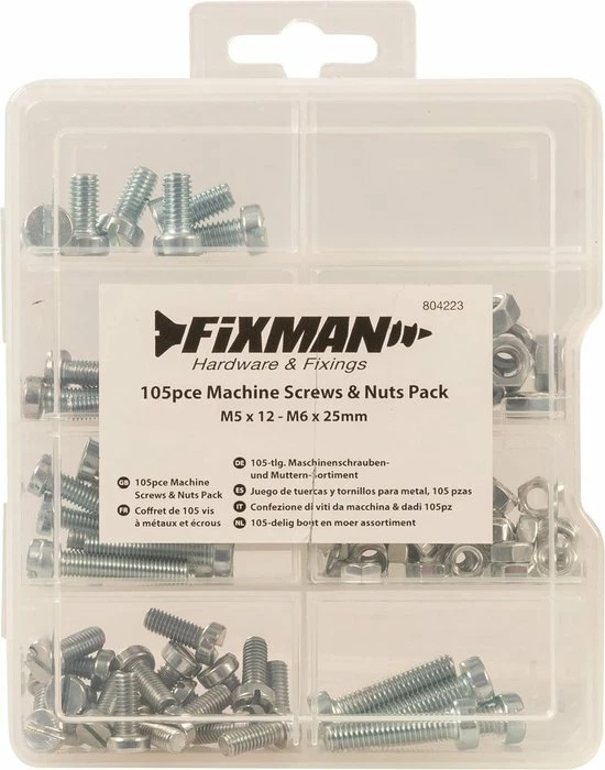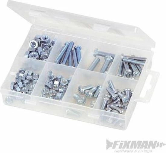 Roestbestendige zink-platering. Sleuf pancilinderkop. Inclusief M5 en M6, zeskantmoeren met maten tussen M5 x 12 tot M6 x 25 mm. Handige gevakte opbergkoffer.