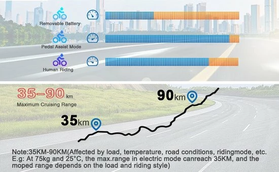 Endurance performance: 35KM-90KM (affected by load, temperature, road condition, driving mode, etc. Example: At 75kg and 25°C, the maximum range in electric mode can reach 35KM, and the range of the moped depends on the load and driving style )