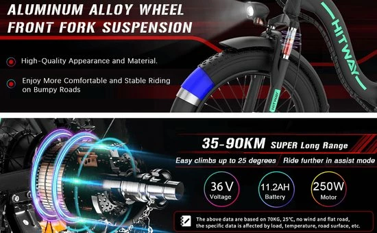 Professional 20″ Fat E-Bike: HITWAY electric bicycle is specially equipped with super-strong 3.0 professional fat tires, which are wear-resistant and anti-puncture. You can ride freely in the mountains and in the city and explore the nature. You can do it enjoy shuttle in snow, sand and other places.