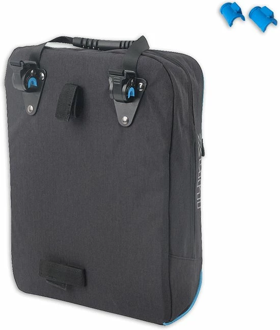 De tas is voorzien van twee opbergvakken aan de buitenkant met rits en drie vakken aan de binnenkant. Het quick-mount systeem zorgt voor een makkelijke bevestiging aan elke bagagedrager tot 15 mm buisdiameter, dus ook de e-bike. De tas is gemaakt van waterafstotend polyester-ripstop en wordt standaard geleverd met verloopstukken voor de dunnere bagagedragers, 8 en 11 mm.