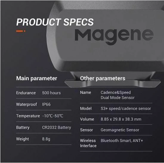 Specificaties van de Magene S3+ Speed/Cadans sensor