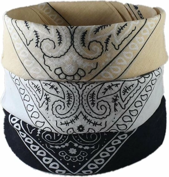 De bandana is weer helemaal hot. Wie kent het niet van bekende celebrities de boeren bakdoek gedragen als hoofdband of om de nek als sjaaltje. Je kan het op verschillende creatieve manieren als accessoires gebruiken om je tas riem of broek. De vintage bandana is gemaakt van 100% katoen je krijgt deze 3pack in de kleuren zwart, wit en beige met gedrukte Paisley print het abstracte textiel motief dat nooit vergaat.