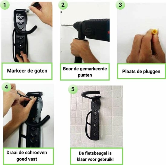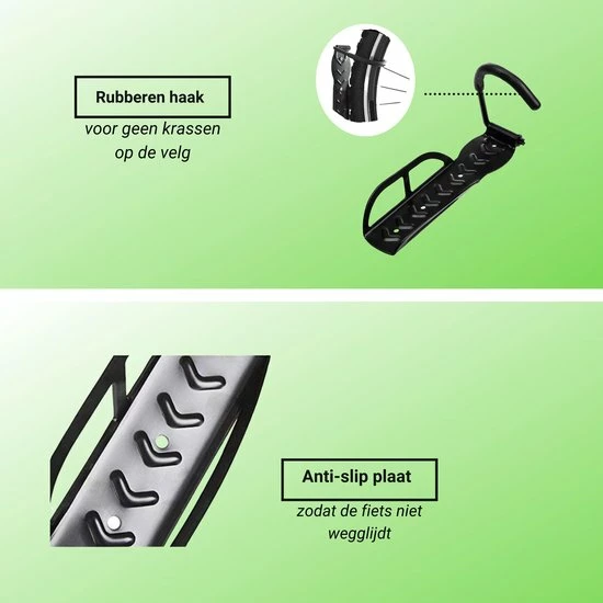 Ook zorgt dit handige fiets ophangsysteem ervoor dat uw fiets niet meer beschadigd raakt, doordat bijvoorbeeld de fiets omvalt of iets anders er tegen aan komt. Door het anti-rubber slipsysteem op de onderplaat zit de band ook zeer stevig vast en zal er niet vanaf kunnen glijden. Bang zijn dat uw velgen van de fiets beschadigd worden hoeft ook niet, doordat de fietshaak een rubberen laag eromheen heeft voor een extrabescherming. De fietsbeugel laat ook geen krassen achter op de muur. De wand moet wel recht en stevig zijn om de fietsbeugel te monteren.?