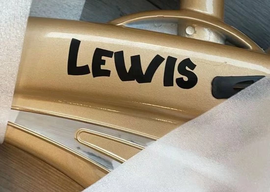 De fiets personaliseren? Dat kan! Vink deze optie aan en laat in de notitie weten welke kleur (Zwart, Wit, Goud, Zilver), welk lettertype en de naam en wij gaan het verzorgen.