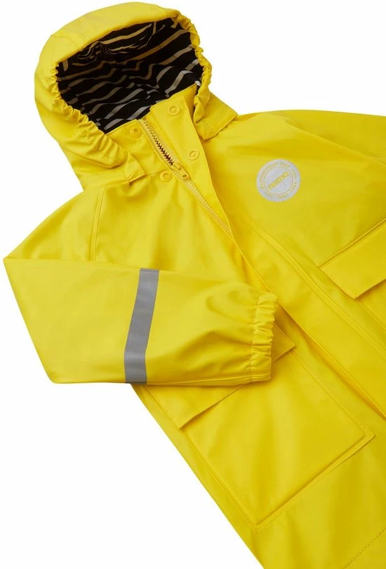 Deze klassieke regenjas met twee grote klepzakken en gestreepte katoenen voering ziet er stijlvol en casual uit. Zoals alle regenkleding van Reima is het materiaal waterdicht met gelaste naden, flexibel, PVC-vrij en verkrijgbaar in 2 klassieke kleuren; geel & marine. Dit product is ook een duurzame keuze omdat de achterkant van het PU-hoofdmateriaal van 100% gerecycled polyester is!