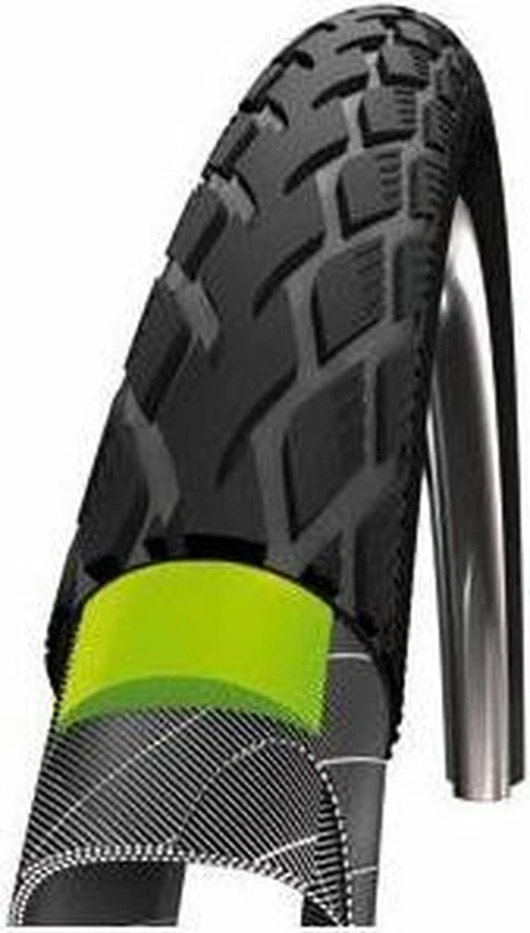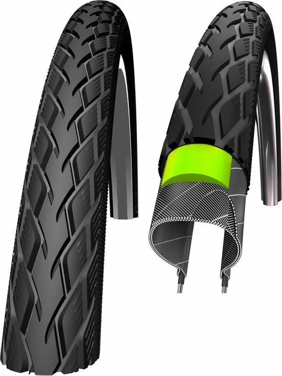 Marathon is de klassieker van Schwalbe. De oervader van alle hoogwaardige tourbanden. De GreenGuard laag uit extreem elastisch natuurlijk rubber is 3 mm dik. De GreenGuard wordt voor 1/3 uit gerecyclede latexproducten vervaardigd. De Anti-Aging zijwand verdraagt de typische overbelasting door een te lage bandenspanning beduidend langer voordat er scheurtjes ontstaan.