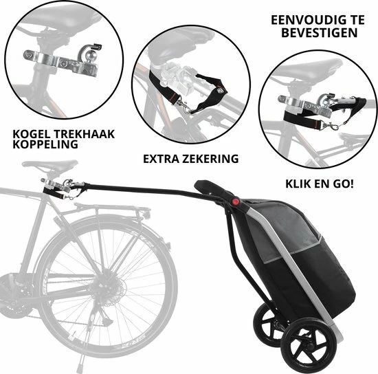 Haal eenmalig het zadel los en plaats hierover de kogeltrekhaak-koppeling. Met een inbussleutel (niet meegeleverd) draai je deze vast om de zadelpen. Plaats het zadel weer terug en je permanente trekhaakkoppeling is bevestigd. De boodschappentrolley klik je vast, plaatst de extra zekering rondom de zadel en koppeling en je kunt erop uit. ( Bekijk de video! )