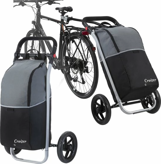De Shoppingcruiser 2 in 1 boodschappentrolley is een uniek en veilig metgezel tijdens en na het boodschappen doen. De robuuste constructie met eenvoudige ?klik & go? koppeling zorgt voor een uitstekende stabiliteit tijdens het fietsen. Wij raden het af om met snelle (electrische) fietsen te rijden. In een handomdraai neem je de boodschappentrolley mee de winkel in door de draagarm in compacte opbergstand simpel in te klappen. De boodschappentas heeft een royale inhoud van 50 liter met een maximale laadcapaciteit van 20kg. Voorzien van een parapluhouder op beide zijdes, soft-handgreep, ritsvak aan de bovenkant voor bijvoorbeeld portemonnee, voorvak, reflectiestrepen en een lus voor een optionele fietslamp. In de tas bevindt zich een 13liter uitneembare koeltas. Om het Nederlandse weer te kunnen trotseren, is de tas vervaardigd uit waterafstotend 600D nylon polyester.